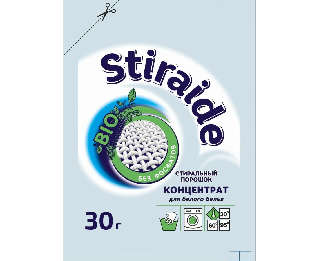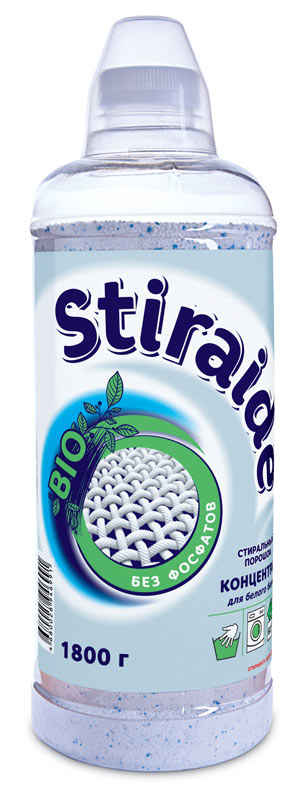Концентрированный бесфосфатный стиральный порошок «Stiraide» имеет отличные моющие характеристики. Предназначен для стирки белых изделий из хлопчатобумажных, льняных, синтетических тканей и тканей из смешанных волокон, кроме шерсти и шёлка. Применяется для машинной и ручной стирки в воде любой жёсткости. Имеет деликатный аромат, надолго сохраняет свежесть белья, заботится о ткани. Благодаря наличию энзимов (биологически активных веществ) удаляет стойкие загрязнения (пятна от травы, пота, крови, вина и жира), не повреждая структуру ткани.